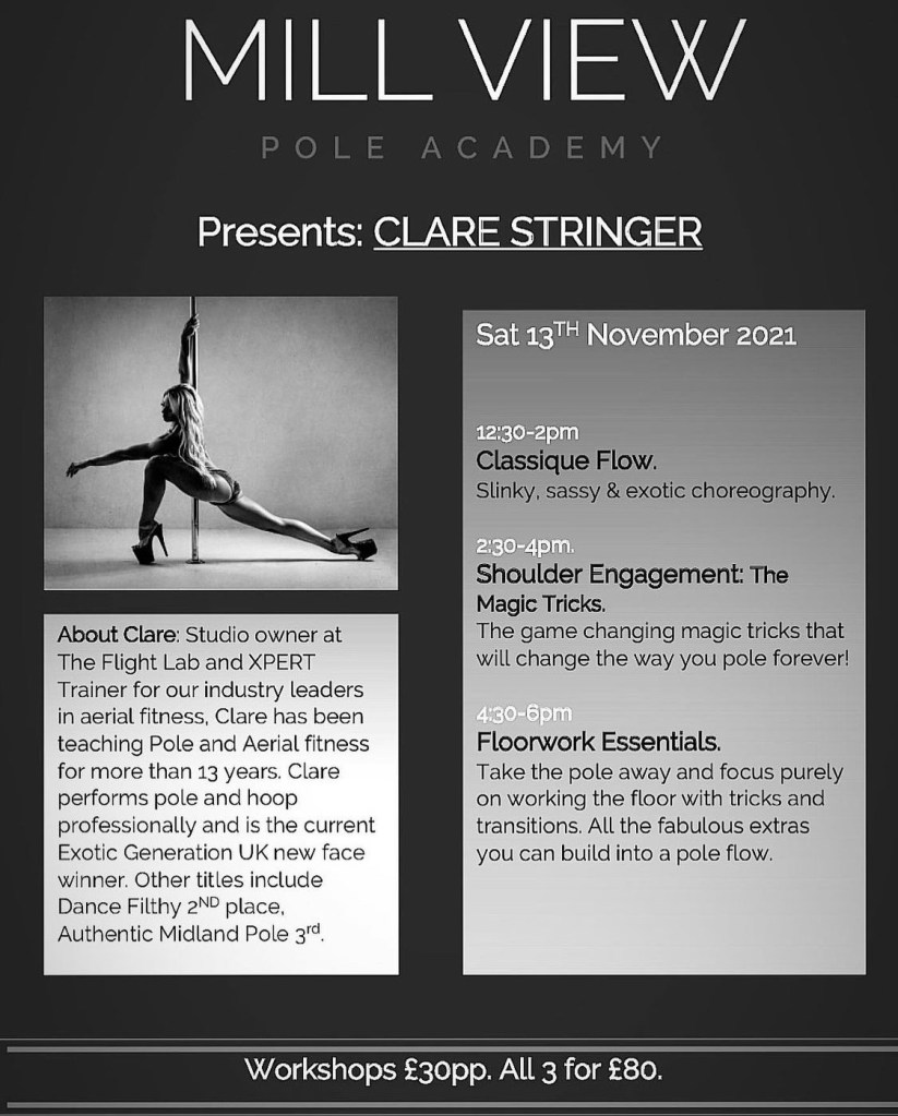 We have the stunning Claire Stringer coming to our studio for slinky and sassy classes. Spaces are filling fast. Please contact us to book your slot.